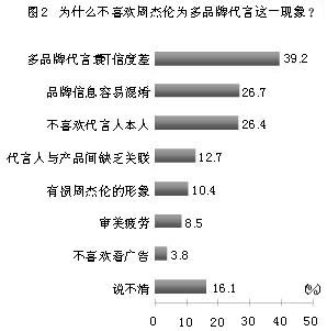 受众如何看待这一现象呢?同一明星为多品牌代言,对于产品品牌、对于明星的个人品牌会有怎样的影响作用?针对周杰伦为服装(美特斯·邦威)、通讯产品(动感地带、松下手机)和饮料(百事可乐、统一茶饮料)等多领域的产品品牌代言的现象,零点研究咨询集团的研究结果表明:12.9%的受访者明确表示无法接受这一现象,不能接受的主要原因在于:多品牌代言导致品牌可信度降低(39.2%的提及率)、多品牌代言容易导致品牌信息间的互相混淆(26.7%)、不喜欢周杰伦(26.4%)、代言人与产品之间缺乏内在关联(12.7%)、谁给钱就给谁代言影响了周杰伦的个人形象(10.4%)。