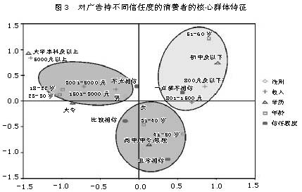 任何广告的目的都在于在消费者心目中放进一点信息,以期影响他们日后的购买决策。在“传播—影响—购买”的过程中,消费者对广告的信任程度是广告实现其影响力的基本平台。零点研究咨询集团的调查结果却表明,总体上看,目前广告公信力状况不乐观:56.1%的受访者明确表示对于各类广告信息并不相信,其中11.4%者表示“一点都不相信”。多元对应分析表明:对于广告信息持“一点都不相信”态度的群体主要集中于低收入、低学历的老年群体;对于广告信息持比较信任态度的群体主要集中于中等学历、中等收入的中年群体;而较高学历、较高收入的青年群体,是消费的中坚力量,也是大部分广告希望达到并影响的群体,他们对于广告更多地持“将信将疑”的态度。这部分群体有较多的知识储备、更为广泛的信息来源和较为理性的消费选择,广告信息只是他们消费决策的依据之一。如何打动这部分群体、获得他们的信任并促使他们的购买行为,是所有广告制作者需要考虑的。