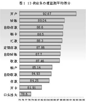 调查的13类业务基本上涵盖了普通消费者感知的银行网点服务的主要内容。从服务评分来看,平均得分为86.53分,接近优秀。但各项业务得分差异较大,开户得分92.67分,口头挂失仅78.6分,从调查的结果以及对比客户的反馈意见来看,各类业务效率近两年都有了很大的提高,在开户、转账、自助存款方面尤为突出。