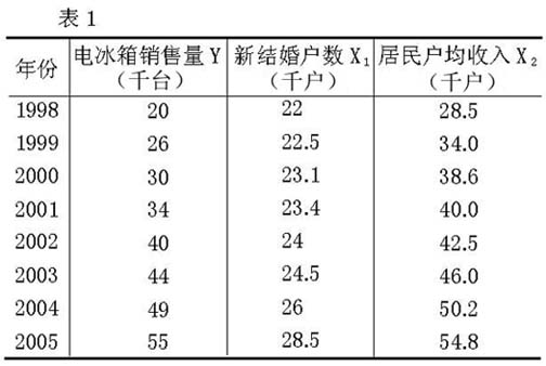例如:一电器公司对某地区电冰箱的销售情况进行了市场调查,其中,年份、电冰箱销售量Y(千台)、新结婚户数X1(千户)、居民户均收入X2(千户)的资料如表1所示: