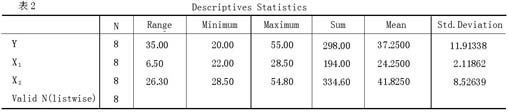 输出结果如表2所示。此表中,从左到右看,分别为变量名称、观测量的频数、全距、最小值、最大值、和、均数以及标准差。