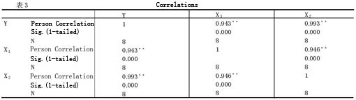 表3显示,电冰箱销售量Y与新结婚户数X1、居民户均收入X2有着极强的正相关,皮尔逊相关系数分别高达0.943和0.993。