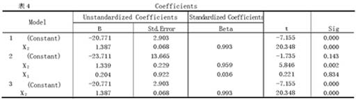 从输出的众多表格中选取表4(回归系数分析表)。其中,Model为回归方程模型编号,UnstandardizedCoefficients为非标准化回归系数,StandardizedCoefficients为标准化回归系数,t为偏回归系数为0的假设检验的t值,Sig.为偏回归系数为0的假设检验的显著性水平值。